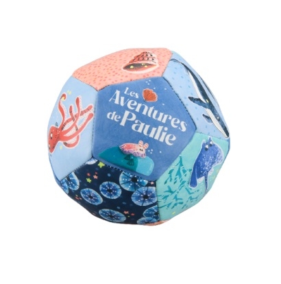 Découvrez la balle souple de la collection Les aventures de Paulie de Moulin Roty, un petit ballon coloré et illustré sur le thème de la mer.