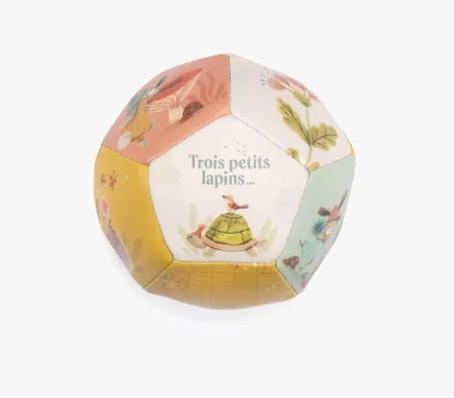 Découvrez la balle souple de la collection Trois Petits Lapins de Moulin Roty, un petit ballon coloré tout léger pour amuser bébé. Une balle souple en vinyle pour jouer à l’intérieur comme à l’extérieur de la maison, avec des faces colorés et illustrées avec les personnages de la collection.