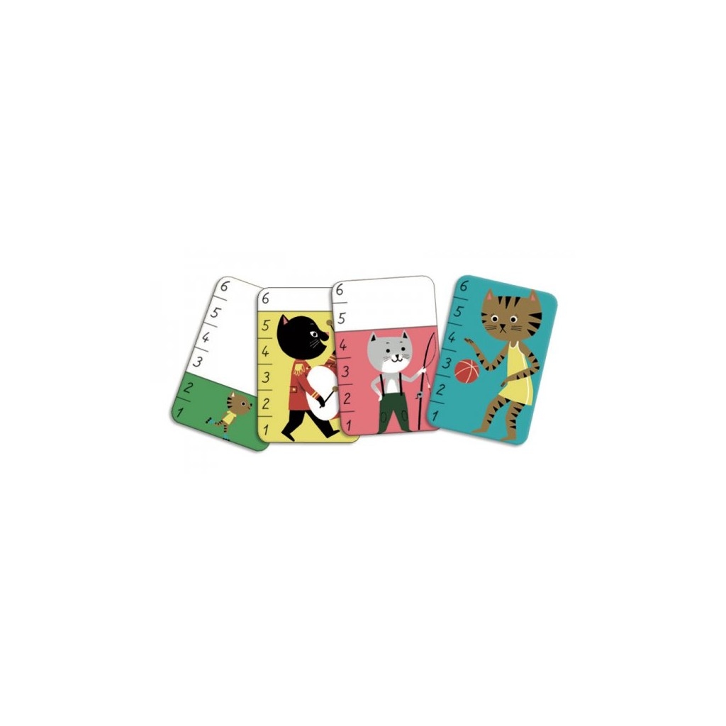 Dans les cartes comme comme chez les chats, il existe de petits et de grands chats. Lorsqu’un grand rencontre un petit, il gagne mais lorsqu’ils sont de même taille, il y a bataille !Une revisite du jeu de bataille adapté pour les plus petits. Les joueurs se repèrent grâce à la taille des animaux, sur les cartes graduées de 1 à 6. De belles parties en perspective !