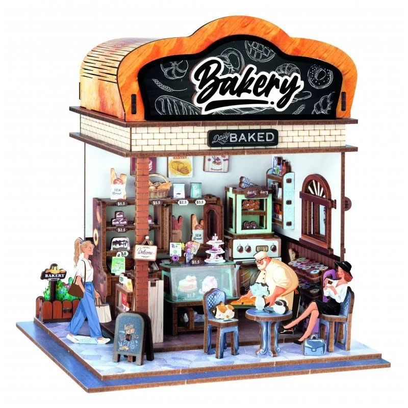 Assemble les pièces en bois et construis ta boulangerie miniature. Colle et place le mobilier, les accessoires, les gourmandises et les clients pour recréer l’ambiance chaleureuse des boulangeries.L’assemblage est facile grâce à la notice illustrée étape par étape et aux pièces numérotées.