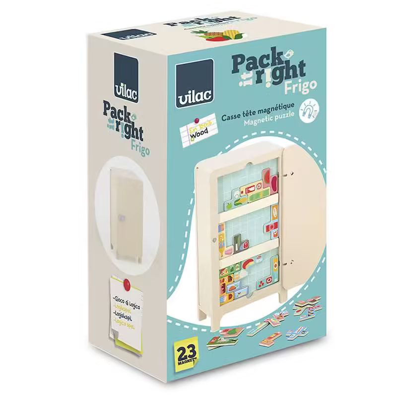 Ce jeu de logique consiste à ranger les pièces magnétiques, représentant des aliments, à l’intérieur d’un frigo en bois en les adaptant aux différents espaces disponibles.