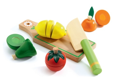 De beaux fruits et légumes en bois à couper sur une planche en bois, pour cuisiner comme les grands.