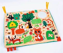 Un tout premier imagier des animaux de la forêt dans une grande illustration foisonnante, avec des matières de couleurs différentes, dans des tons tout en douceur. À utiliser en tapis d’éveil ou à suspendre dans le lit de bébé.