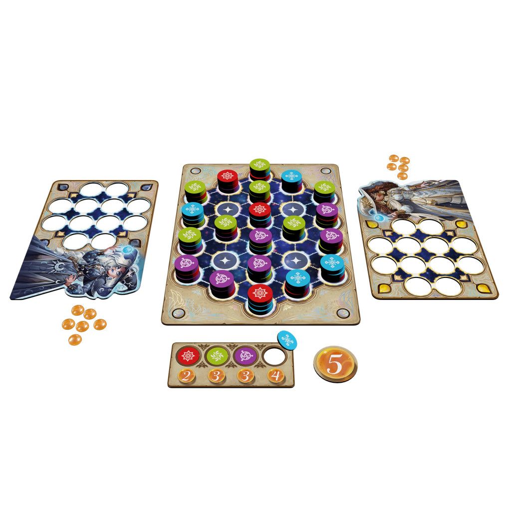 Mystria est un jeu de placement et de stratégie pour deux joueurs, dans lequel vous devrez utiliser de l’énergie afin de déplacer des jetons et former des triangles de même couleur sur le plateau, pour remporter la partie.