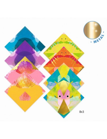 Plongez sous l’océan avec cette pochette d’origami où les animaux miroitent ! Hippocampes, dauphins, poissons et coquillages rehaussés de doré sont au rendez-vous… En suivant les explications du livret et les tracés, l’enfant effectue les pliages pour réaliser 24 animaux marins en papier !
