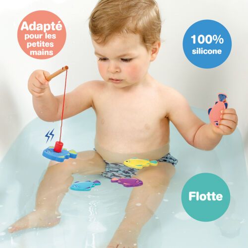 Jeu de pêche magnétique avec canne en bois et 5 poissons en silicone texturé, conçu pour développer la motricité fine, la coordination œil-main et la concentration lors des jeux d’eau dès 18 mois.