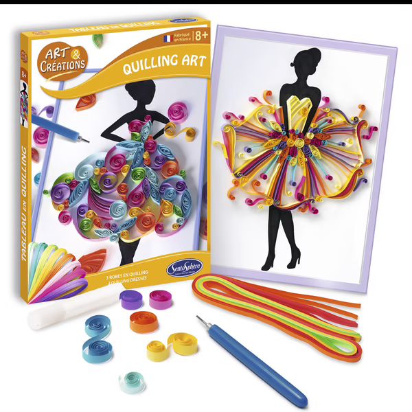 Dans ce kit votre enfant aura 2 illustrations colorées pour faciliter la création de 2 magnifiques robes et lier créativité et mode. Il aura aussi à sa disposition plus de 120 bandes de papier multicolore afin qu’il puisse en créer de toutes les couleurs et laisser parler son imagination ! Il lui suffira ensuite de mettre des points de colle et les robes seront prêtes pour le défilé où il pourra les montre fièrement à toute la famille.