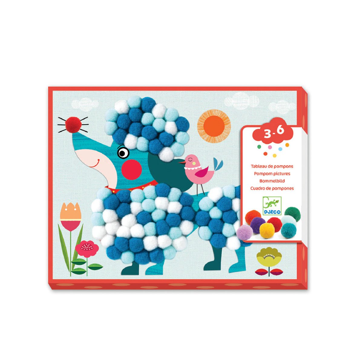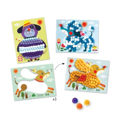 Découvrez ce chouette coffret de pompons à coller de chez Djeco.