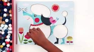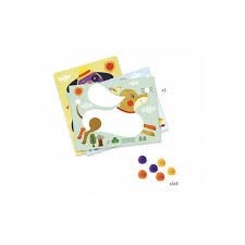 Guidé par le livret, l’enfant complète les 3 cartes chien en collant des pompons colorés sur les parties autocollantes des tableaux.