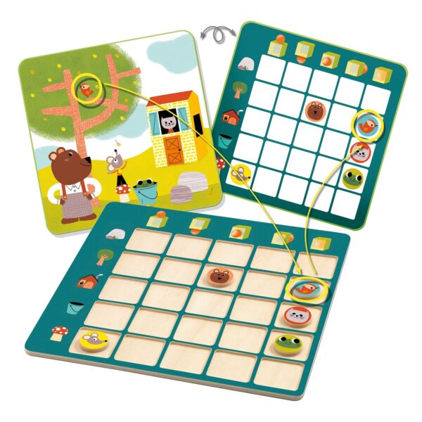 Trouvez les positions de 5 animaux par rapport à 5 éléments du décor et placez habilement les jetons.